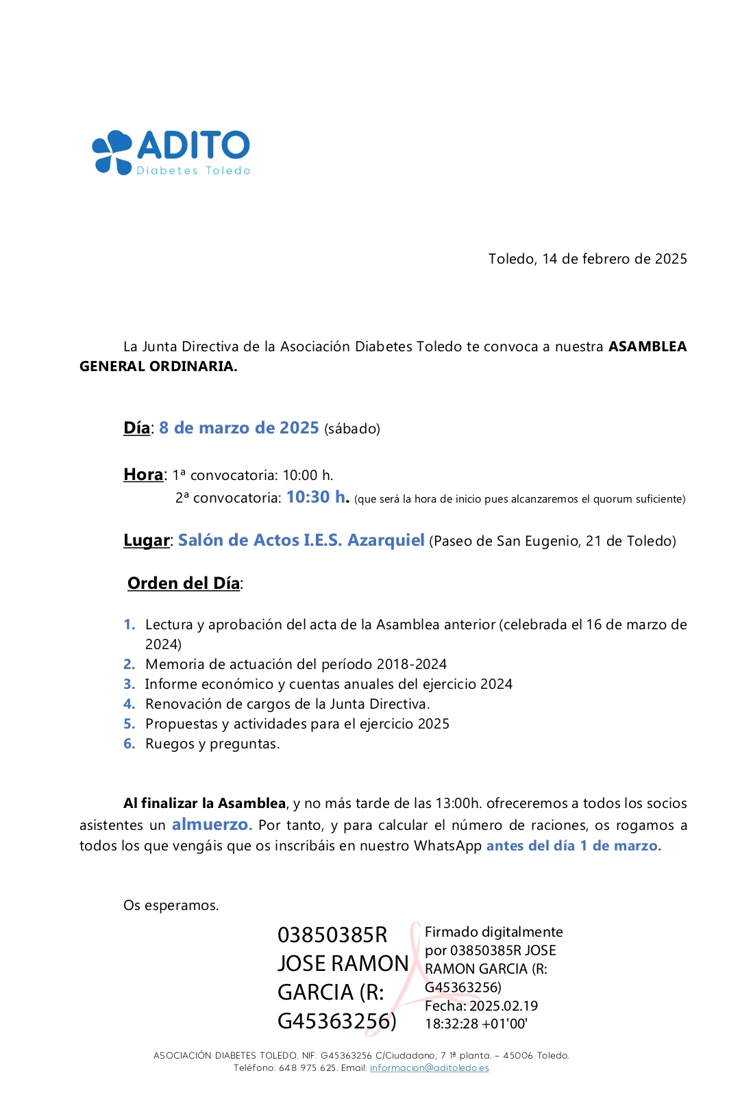 El proximo domingo 16 de marzo se celebra, de forma presencia, la Asamblea General de Socios de ADITO 2024. En el siguiente documento